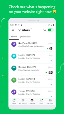 JivoChat er en omnichannel business messenger designet til teams. Forbind med besøgende via live chat, Facebook, e-mail og mere – alt samlet i én app. Mist aldrig en konvertering igen. JivoChat forbedrer websitekonverteringer med proaktive invitationer og organiserer al kundekommunikation effektivt.
